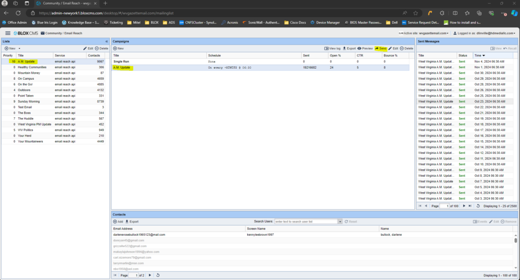 BLOX CMS (admin-newyork1.bloxcms.com) - Select the active site that needs the newsletter resent from in the top right-hand corner of the page.