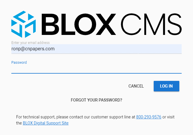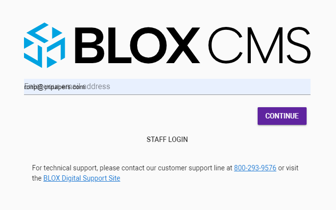 First access Hosted BLOX and enter email address (ignore STAFF LOGIN, this is literally a BLOX staff link): https://admin-newyork1.bloxcms.com/desktop/#/