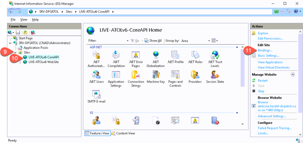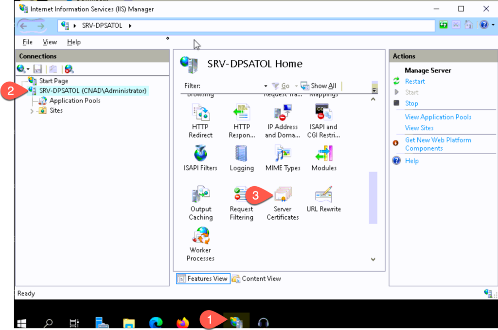 - Launch the IIS Manager from the taskbar, select the ATOL server, and then Server Certificates.