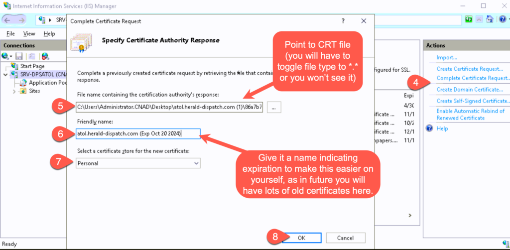 - Select Complete Certificate Request from the Actions menu on the right and browse for the CRT file you just obtained in step 1.