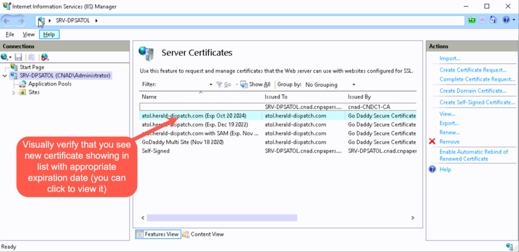 - Hit OK to show the certificates and verify that you see the new certificate showing with the appropriate date.
