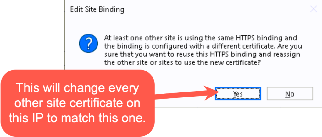 - You will see a message that at least one other site is using this binding. You will select Yes and this will change every other site certificate on this IP to match this one.
